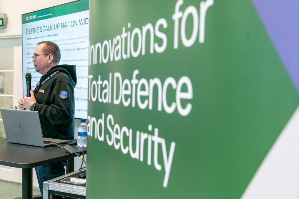 Puolustusministeriön resurssipoliittisen osaston ylijohtaja Olli Ruutu korostaa teknologisen innovaatiotoiminnan merkitystä nopeasti muuttuvassa turvallisuusympäristössä.